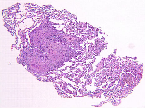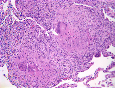 Pathology: The patient underwent flexible bronchoscopy and several transbronchial biopsies were taken. The biopsy sections showed alveolar parenchyma with small non-necrotizing granulomas (Figure 3). These granulomas tended to aggregate, as seen in Figure 3, with several nodules coalescing into a larger, rather discrete lesion. Also, there was minimal chronic inflammation around the granulomas and no inflammation extending out from the granulomas into surrounding lung parenchyma. These secondary features were useful in separating the granulomas of sarcoidosis from those associated with infections (where in addition, necrosis is commonly present). The granulomas of sarcoidosis typically have associated hyaline sclerosis (not evident here), but this finding was not a prerequisite for the diagnosis. At a higher magnification (Figure 4) several multinucleated giant cells were observed, another nonspecific feature. Sometimes distinctive inclusions can be seen in the granulomas of sarcoidosis (Schaumann bodies, asteroid bodies), but these are not specific for sarcoidosis. Whenever granulomas are present in a lung biopsy, the differential diagnosis is broad and includes infection, sarcoidosis, berylliosis, hypersensitivity reactions, pneumoconioses, certain lymphoproliferative diseases, aspiration, and even intravenous drug abuse. At a minimum, special stains for acid-fast organisms and fungi should always be performed.
